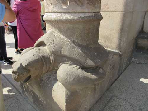 「カメの彫刻」が柱を支えている。
