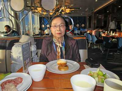 5月11日(日)の午前中約2時間は、Tさんは豆にお洗濯をし、持参したワイヤー製のハンガーにかけ、ベランダの椅子の背につるして乾かす。私はベッドに横たわり休養する。昼 食ディナー時のレストラン「オリヴィエート」へ向かう。ところで私達の部屋は船の前方にあり、レストランは各階の後方にある。食事毎に約250mの距離を往復しなければならない。私達にとっては結構な距離で、毎回ウォーキングの運動をしているようである。12:30 営業開始と同時に、違った雰囲気の奥の席へ案内される。昼食はコース料理である。ナイフとフォークコーラ:Tさん用白ワイン:私用前 菜パスタパ ンメインデザート昼食中のTさん昼食中の私どの一皿も、生クリームをたっぷり使っているようなこってりとした味わいである。港の風景を眺めながら、90分ゆったりとお食事と語らいを楽しむ。サボナ港