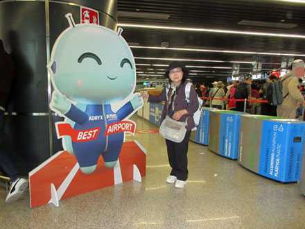5月17日(土) バスは順調に走り、正午少し前にローマ空港に到着する。 ローマ空港レオナルド・ダ・ヴィンチ国際空港(別名フィウミチーノ国際空港)は、フィウミチーノ市にある国際空港で、イタリア最大の空港である。ローマ空港のマスコットと共にローマ空港内にて Tさん後ろは搭乗手続きの開始を待つ中国人グループの長蛇の列。イタリア国内で有名なジェラード店Venchi(ヴェンキ)にて1個5ユーロの大盛りのジェラードを手にして。高いけれども抜群の美味しさに感動する。「何がこの美味しさを分けるのか?」と、不思議に思う。ブランド店の揃う一画にてツーショット14:00 遥か遠くのE22ゲートへ向かう。お土産のイタリア製のチョコレート入りのバッグを持ってチェスを楽しむ人々更に動く歩道で移動していると、速足で若い中国人男性が近寄ってきて英語で私に話しかけてくる。ちょっと身構えてしまった私でしたが、出国ゲートを通過して最初のお土産店で買い物をした時に、Tさんがカードを取り忘れていることを教えて下さいる。その親切なご行為に、「Thank you so much!」と、心から感謝申し上げる。時間的にはまだ余裕があり、戻ることにするが、遥か彼方の出発点に徒歩で再び戻ることに疲れを感じる。私達を見ると、直ぐ店員さんが安堵した表情でカードを手渡して下さる。思わぬハプニングが起こるものですね。皆さんのご協力に心から感謝する。