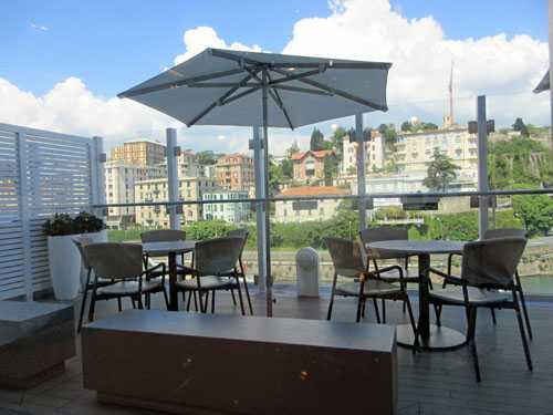 〈日程10日目〉2025年5月17日(土) 8:30 チビッタベッキア港に入港専用車 港からローマ空港へ(75km/約1時間30分)15:45 EK098ローマ発 → ドバイへ飛行時間:約5時間45分23:30 ドバイ着【機中泊】8:00 全ての手荷物を持ち9070号室を退出する。D8 後方 ビュッフェレストランで朝食を取る。朝食中の私船はチビタベッキア港へ入港中9:30 D6 グランドバー集合集合時間まで近辺のソファで寛ぐ。Grand Bar Leonardo10:00 専用バスに乗車し、チビタベッキア港を離れる。コスタ・トスカーナとのお別れ港の倉庫のような建物海沿いの風景拡大してみると、接岸中の商船地中海の麗らかな風景を眺めながら空港へと向かう。遥か彼方に豪華客船コスタ・トスカーナを臨む。一路ローマ空港へ。