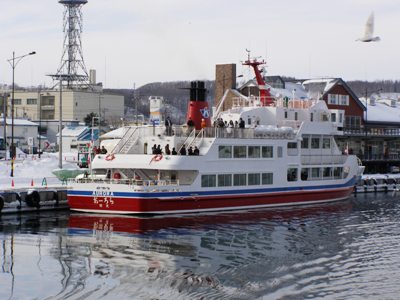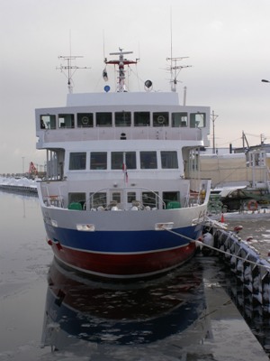 19・20日と同期会のため網走に行ってきた sobajin 。音更町の N 氏、紋別市の Y 氏と一緒に幹事をつとめました。九州や関西から来た同期生たち、お目当ては、カニと流氷。カニのことは心配なかったのですが、流氷の動きには sobajin も気をもみました。9日に流氷が接岸、「やったー」と喜び、参加者にはメールで流氷情報を送っていました。ところが、18日夜に、ニュースで観光船の話題が流れていたのですが、19日には、沖合いはるか肉眼では見えないところまでいなくなってしまったとのことでした。風向きでこのようなことは当たり前のことだそうです。同期会懇親会の席上説明するもどれだけ理解してもらえたのか、でも、飛行機が女満別空港に着陸の際、海上まで旋回し流氷を見せてくれたとか、その一言で安心しました。2日目の朝、流氷に会えることを願って観光船乗り場へ、でも流氷本体はないという。私達が乗船したのは「オーロラ2」、流氷観光最盛期とあり2隻で運行していました。 出航まもなく、テトラポットの上に「オオワシ」発見、 sobajin のカメラではこれが限界。 はぐれ流氷帯の中を低速で航行しながら、船長がアナウンス「流氷本体とはスケールが違いますが、流氷の気分だけは味わってみてください」と。そして、こんな氷でも、船体に当たると鈍いひびきが身体に伝わり、流氷の存在を感じさせてくれました。 観光船の周りには、かもめでしょうか、何羽も飛来しえさをねだっていました。 同期会に参加した仲間達も、流氷の一部を体感したようでした。それにしても、気温がプラスまで上がり、温かい航海で、厳寒を覚悟してきた仲間達、口々に「暖かい、北海道のほうが暖かい」と言っていました。