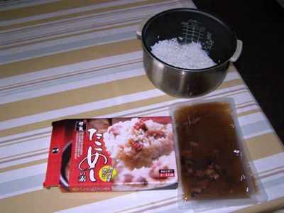 お土産の紹介第2弾。兵庫県姫路市から参加の I さんからいただいた「たこめしの素」。昨夜早速作りました。 作り方のとおりやってみました。洗っておいたお米を炊飯器に入れ、「たこめしの素」を入れてスイッチオン。やがて、美味しそうな匂いが漂い始め、20分ほどで炊き上がりました。 瀬戸内特に明石のたこは有名ですが、炊き上がりの「たこめし」は香りも良く、味も瀬戸内の味を醸し出していました。 I さん美味しかったです。本当にありがとう。