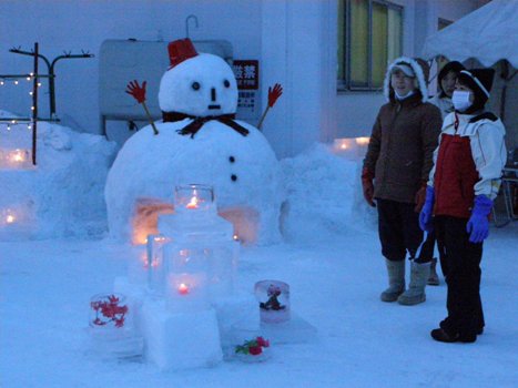 町内にある NPO法人新得町共同作業所かりかち工房 では、いつも運営を支えてくれているる地域へのお返しとして、アイスキャンドルで夜を彩る「氷灯夜」を行っています。 利用者たちが作った350個のアイスキャンドルを並べ、その中に、彼らが作った赤いろうそくを入れ明かりをともしています。 同工房では、牛乳パックを利用したはがきやしおり、カラーキャンドルを作っており、ドライフラワーを漉き込んだりした作品は人気が高くなっています。アイスキャンドルは、寒い日が続くこの時期、バケツに水を入れ戸外に置いて作られます。氷結の途中で穴を開け残っている水を出して完成ですが、造花なども入れられ素敵なできばえです。 12日の夜から始まった「氷灯夜」、午後5時から明かりが入れられ同8時まで幻想的な夜を演出しています。