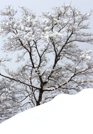 朝早く、除雪車の走る音で目が覚めました。カーテンを少し開け外を見ると20センチほどの降雪がありました。 布団から抜け出し、着替えを済ませ我が家の除雪機も出動と相成りました。30分ほどで除雪を終らしましたが、周りの木々を見ると新雪が載っていました。ふだん何気なく見ている木々たちですが、雪をいただいた光景はいつもと違った風情でした。 庭にある、松の木の松毬は、昨年秋に種を飛ばしたままで雪をかぶっています。楓の枝も、じっと春を待っています。 降ったり融けたり、あと何回か繰り返して春を迎えるのでしょう。