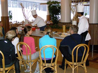 昨日もクラブメッドサホロで蕎麦打ちをしてきました。真冬のクラブメッドサホロのメインは、なんと言ってもパウダースノーが楽しめるスキー。でも、家族で着てみたものの、ホテルでお留守番のご夫人方も結構いらっしゃいます。バカンスで退屈させないのがクラブメッド。そこは、スタッフが知恵を絞り至れり尽くせりのサービスが提供されます。1/24に紹介したように、キッチンチームは、日本の食文化「寿司」をそうした方たちに紹介しています。 発案者は、sobajin もお世話になっている総料理長のラビンさん。大の日本びいきです。そして、寿司の技を披露するのは、かの Norio さん。 この日も、オーストラリアからのお客様ら10人余りが寿司作りの技と味を楽しんでいました。 sobajin の蕎麦もそうですが、こうした日本の食文化を広めてくれる取り組みは大切なことだと思います。ちょっとした心配りが、海外からのお客様にも印象に残る「もてなし」としてお持ち帰りいただけるのではないでしょうか。