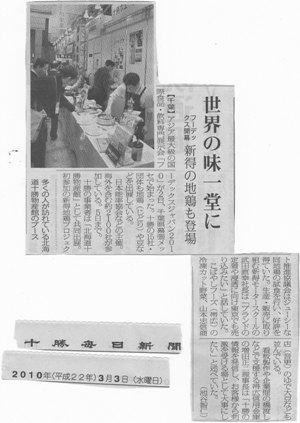 幕張メッセで2日から開かれている「フーデックスジャパン2010」に、わが町が特産品として開発に力を入れている「新得地鶏」が初お目見えしています。昨年、sobajin が定期的に成長記録をアップしてきた「新得地鶏(北海地鶏ii)」、アジア最大級の国際食品・飲料専門展示会に、今年初めて参加、地鶏の試食提供を行って、そのジューシーさに好評を呼んでいるとのことです。 新得地鶏プロジェクト推進協議会として「北海道十勝物産館」のブースに出展しています。興味のある方は覗いてみてください。明日までの開催です。新得地鶏製品照会・お求め先