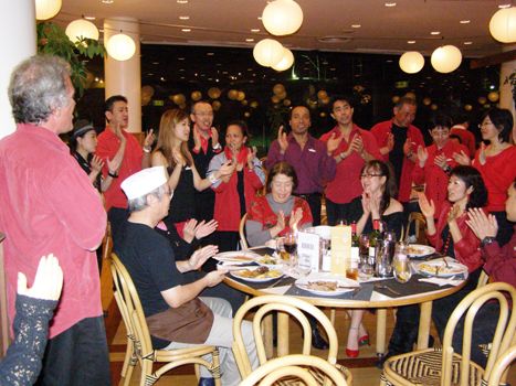 友人夫妻とともに「クラブメッドサホロ」で、地元特産の新得そばの手打ちを披露していることは何回もご紹介していますが、昨日はとてもビッグなサプライズがありました。3月12日は、sobajin 妻の「○回目」の誕生日でした。いつものようにお客様にお出しする蕎麦を用意し、ディナータイムのデモ打ちも終らせ、いつものように友人夫妻とともにテーブルに着き、食事をいただいておりました。もちろんテーブルには一般のお客様もいらっしゃいました。テーブルで「今日誕生日なんです」なんて話していたときですが、レストランの一角がにぎやかになりました。ディナータイムのドレスコード「赤と黒」の衣装に固めた「GO(滞在中のお世話をする従業員の呼び名)」たちが、拍手をしながらこちらのテーブルに近づいてきます。そう、誕生日プレゼントのケーキ贈呈でした。彼らは、妻の周りに来ると、手拍子とともに「ハッピーバースディ」の歌を歌い始めました。お客でもない妻にまで、お祝いをしてくれたのです。 クラブメッドでは、滞在中のお客様が誕生日を迎えると、ケーキをプレゼントして、みんなでお祝いをしてくれるのです。sobajin 妻は、予期しない出来事に大喜び、すっかり顔見知りになったGOたちに感謝していました。しばらくすると、こんどは白の軍団が、手拍子でテーブルに近づいてきました。そう、料理長を先頭にした「キッチンチーム」のシェフたちです。ビッグプレゼントを持ってきてくれました。それは、デコレーションした大きな「メモリアルブレッド」でした。そしてまた「ハッピーバースディ……」のコーラスです。一度ならず、二度のサプライズに、妻のひとみには光るものがありました。 美味しいご馳走をいただき、料理長からはシャンパンもいただき、パティシェたちが作ったデザートをいただきながら、素敵な誕生日を味わった妻、みなさんには感謝で一杯でした。本当にありがとうございました。 えびとアボガドのサラダ ポークハムの赤ワイン仕立て 同上 蕎麦ではありません。モンブランタルト フルーツタルト この飲み物はスペシャル(別料金です) ちなみに、sobajin は、アッシーを努め、ウーロン茶で乾杯でした。