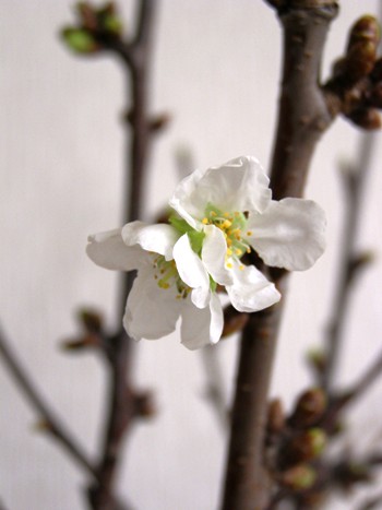 今朝は氷点下12.1度まで下がりました。でも、そんな中に、塀の下の植栽枡には、水仙が芽を出しました。こんなふうに一進一退を続けながら春が来るのですね。もう一つ春をご紹介します。 先日剪定したさくらんぼの枝を室内で花瓶にさしておきました。白い可愛らしい花を咲かせてくれました。 今年の実付きはどうなのか、庭の木の花が咲く前から楽しみです。