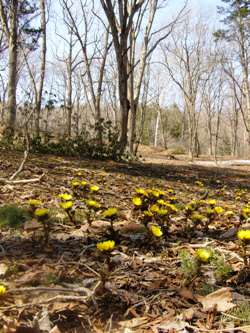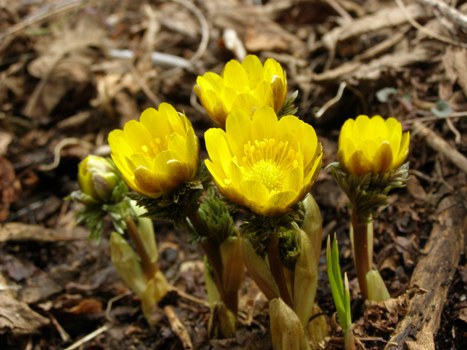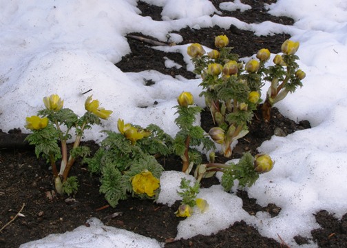 15日朝10センチ近く降った雪も、春の淡雪ですぐ融けました。神社山の南面では、一面に福寿草が花を咲かせていました。時ならぬ大雪にもめげず、福寿草が今を盛りと咲いています。 南に面する陽だまりのせいか、雪もすぐ融けて、雪の下になっていた福寿草も元気に顔を出しました。 神社山は、このあと5月連休明けにエゾヤマザクラが開花し、山全体がピンクに染まります。