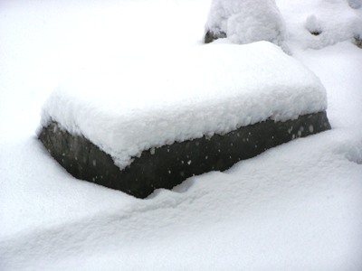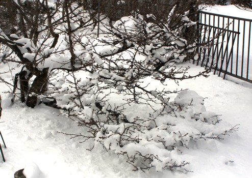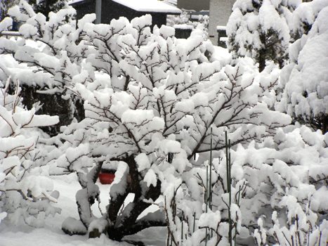 昨日午後からの雨が霙に変り夜半からは雪に、今朝はご覧のとおり10センチほどの積雪になりました。千島桜の枝にも雪がのり、花開いたばかりのクロッカスも、チューリップの芽もすっかり雪の下になっています。 あーあ、春はいつ来るの ?