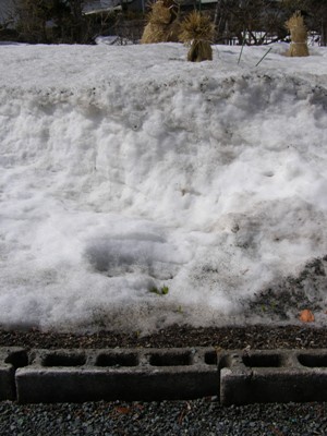 庭のクロッカスが目を覚ましました。冬の間中雪の下で、じっと春を待っていたクロッカスが、雪解けとともに目を覚ましてくれました。少し庭の雪を崩したところにクロッカスが眠っていました。2日ほどでクロッカスの芽を見つけました。元気です。 庭には、まだこんなに雪が残っているんですよ。 いよいよ春の話題が多くなってきました。今日、釣堀がオープンしたというニュースが入ってきました。ニジマスにでもあってきたいと思います。