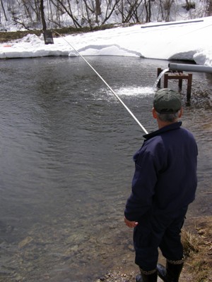 新得町漁業生産組合の釣堀が今日オープンしました。釣堀には、オープンを待ちわびた釣り人たち10数名が訪れ竿を出していました。 この釣堀もご他聞に漏れず雪解けが遅く1面のみのオープンとなりましたが、30センチ超のにじますが釣り上げられていました。 今日オープンした釣堀は、11月30日まで、毎日午前8時から午後5時まで営業しています。料金は、餌・竿のレンタルのときは<大人2500円、小学生以下が1500円で2時間、道具持参のときは、それぞれ2000円、1000円となります。釣堀は、新得市街から狩勝峠に向かって約10キロ、薬草温泉の手前で左折して500メートル。国道縁にこの看板があります。 問い合わせは、新得町漁業生産組合 0156-64-6593 へ。