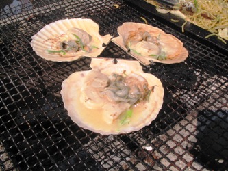 先日今年初めてのバーベキューをしました。長男一家と二男も帰省して久しぶりに家族が勢ぞろいしました。おりしも、気温は20度近くまで昇りようやく春になった感じで、冬の間片付けてあったブロックを出してきて炉を作りました。長男が調達してきたホタテ・つぶ・牡蠣のほか、イカ・豚串・牛肉と材料は十分。昼過ぎから夕方まで楽しみました。 他の材料は、食べるのに忙しく撮影していませんでした。オット、忘れていました。ココアも来たんです。 大好きジージに抱っこされてるのですが、「なぜわたしにくれないの ? お肉」と、実は放しておけなかったんです。