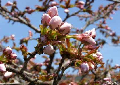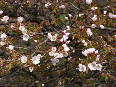 やぁー待ちました。こんなに待たされたのは初めてですね。我が家の「チシマザクラ」本日開花いたしました。 樹齢30数年になる我が家の「チシマザクラ」ですが、いつもエゾヤマザクラより1,2日早く開花するのです。チシマザクラの花は、エゾヤマザクラより小ぶりで、色も少し白いようです。でも、しっかりと自己主張しています。 わが町の桜の名所「新得神社山」も三分咲きくらいでしょうか、山が紅くなっています。2,3日暖かい日が続くようですから、仕事を終ってから桜の下でお花見をする町民のために、ライトアップもされるのですよ。ちなみに、豊後梅の蕾はご覧のとおりです。開花まではもう少しかかりそうです。 新得神社山の開花状況は以下をご覧ください。新得神社山桜情報