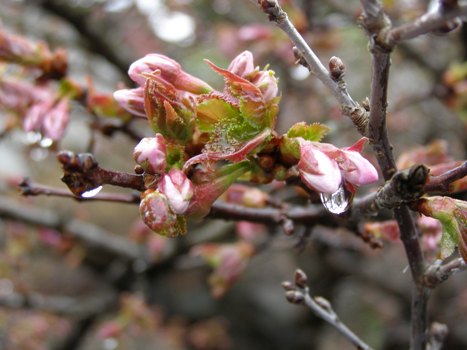 道南松前での開花宣言に続いて札幌の桜も開花が宣言されました。桜前線も北海道上陸です。我が家の桜は ? というと、もう少しのようです。好天が続いたゴールデンウィークが明けて、夜来の雨に庭の木々たちも元気を取り戻したようです。もうかれこれ三十数年を経ている我が家の「チシマザクラ」も、開花の準備をしています。昨年は5月4日が開花でした。開花が待ちきれず、今の「千島桜」の様子をご紹介します。 少しピンクの色がのぞいています。 こちらでは、桜のあとに梅が咲くんですよ。そして色とりどりのつつじたちが花開くのもまもなくです。