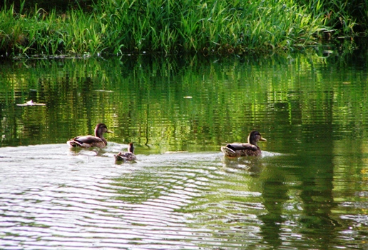 まちの真ん中にある町民体育館横の池には、数組のマガモが親子連れで遊んでいます。ここで孵化した家族なのか、どこからかやってきたのか、暑い日差しを避け木陰で休んでいます。sobajin のカメラの望遠ではここまでが限界のため、そばに近寄ると池の中に逃げていきます。なんか、「ここまでおいで」と、馬鹿にされた気分なんですが、この暑い日に水に入れるのがうらやましいですね。 ちなみに、マガモは、首やら尾のほうの色が綺麗だと思っていたのですが、あの毛の色は繁殖期に変わるのだそうで今はまだ茶系なんだそうです。Tonkaさんに教えていただきました。