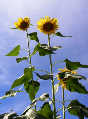 台風崩れの温帯低気圧の通過で、昨日は雨、今朝は抜けるような青空が広がりました。気温も予報では29度となっていますが、湿度が低く風があるため爽やかな一日になりそうです。そして、向日葵が揺れ、なんとなく秋を感じさせる日になっています。 先日地元紙で4メートルを越す向日葵が評判になっていました。我が家の庭にも野鳥の餌台を囲むように向日葵が成長しており、その高さは3.5メートルを超えています。お気づきでしょうか、この向日葵は種を蒔いたのではなく、野鳥の餌の中にあった向日葵の種がこぼれて春先芽を出したものなんです。 一時は抜いてしまおうとも思ったのですが、このまま大きくして、秋に種を採ると野鳥への給餌に使えると思い育てたものなんです。今年の冬、野鳥たちは、やけに向日葵の種が多いなー、と思うのではないでしょうか(笑)