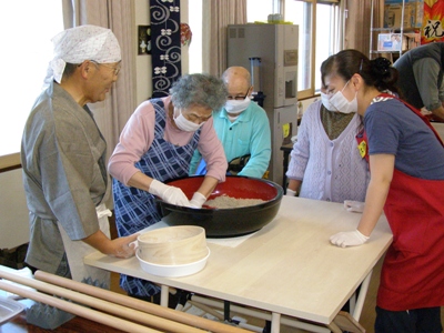 会の仲間たちと、今年で10回目になる老人ホームへの新蕎麦手打ち慰問に行ってきました。一年に一度お邪魔するだけのわれわれを利用者の方々は待っていてくれました。顔なじみの方もいて、早速手打ちの開始です。 まずは水回しから、数年前から、利用者の皆さんにも手打ち体験をしてもらっているので、上手な方もいらっしゃいます。それよりも「昔取った杵柄」なんでしょうか。延しでは、会員の手さばきを見て「自信がない」としり込みする方もいましたが、器用に延し棒を操る方もいました。 いよいよ切りに入り、皆さんは大きな蕎麦切り包丁が珍しいらしく、感心したり、どう使えばいいのかなど会員に尋ねながら、蕎麦切りに挑戦していました。 介護の職員も体験に飛び入り、慣れない包丁に悪戦苦闘していました。およそ70人前の蕎麦を1時間ほどで打ち上げ、お昼にはあたたかい天ぷらそばと冷たいそばの2種類に舌鼓を打ちました。お代わり自由とあってかなりの方がお代わりしていました。この老人ホームは、現在改築工事が進行しており、来年には完成とのこと、私たちの慰問もこの次は新しい施設での慰問になります。