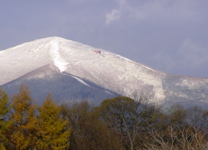 晩秋の郊外を走ってきました。取入れが終った畑と防風林越しに、佐幌岳(1,059m)が見えました。佐幌岳の山腹は、サホロリゾートスキー場が広がり、コースの一部が白くなっています。頂上直下にはゴンドラの山頂ステーションが望めます。 まもなく山肌は真っ白に雪で覆われ、多くのスキーヤーやボーダーたちで賑わうことでしょう。