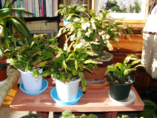 昨日アップした中に、クリスマスカクタスのこと少し書きました。今日は、シャコバサボテンと総称される我が家のクリスマスカクタスと、デンマークカクタスの今現在の状態をご紹介します。我が家にあるシャコバサボテンは3種類4鉢です。夏の間外に置いて栄養をつけさせ、10月のはじめに屋内へ入れました。 シャコバサボテンは、日が短くなると蕾をつけ始めます。そこでダンボールで覆いをしたり、しゃこうまくをされるかたもいるようですが、sobajin は自然任せです。強いて言えば,夜明かりのつかない部屋(使わない部屋)に置いておく程度です。 これからはクリスマス時期に花開くよう温度調節していきます。 時期にお店へ行くととてもお安く手に入れることができるのですが、花が終ってもありがとうを忘れずに手元に置いてやっています。