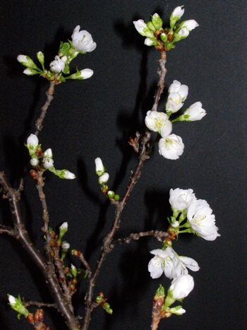 立春の日に枝を花瓶に挿しておいたチシマザクラが開花しました。15日ほどでかいかとなりましたが、5月に庭で咲く花より白い花です。(2010.5.16当ブログ参照) 日中は22度前後、夜は14度前後に温度を確保した結果です。一足早い春を楽しみます。