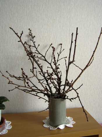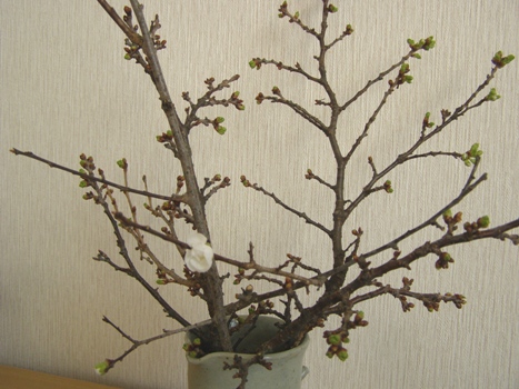 立春の日にチシマザクラの枝を花瓶に挿し居間に置いていましたが、一輪花開きました。ところがこの花はチシマサクラではない、しばし思い起こすと、そう「豊後梅」の枝もいっしょに挿しておいたのを思い出しました。 都々逸に「梅は咲いたが、桜はまだかいな……」と謡われますが、当地では、桜が先に咲きそのあとすぐに梅が咲くのです。でも、今回同じ日に暖かいところへ取り込むと、梅が先に咲くことが分かりました。で、チシマサクラはどうかというと、こんなんでした。雛祭りより先に春が来そうです。 チシマザクラが咲いたらまたご紹介します。ちなみに、外で桜が咲くのは、5月10日ころです。