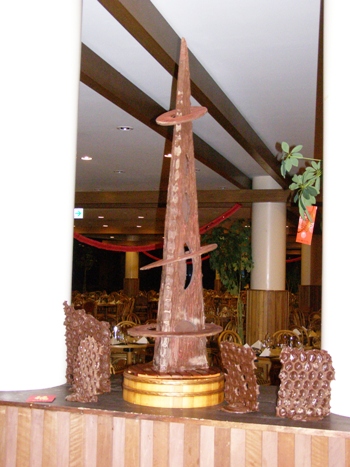 昨日春節で賑わうクラブメッドサホロの蕎麦打ちデモに行ってきました。600人の宿泊定員を持つホテルも満館になって、館内には外国人の旅行客で溢れていました。sobajin たちは、夕食に出す手打ち蕎麦を準備し、ディナータイムにはレストランで手打ちの技を披露します。さらに、外国からの子どもたちには蕎麦切りの体験もしてもらいます。私たちにできる郷土PRとして定着しました。興味深く見守る外国人や、そば通の日本人客から喜ばれています。昨日は、おりしも春節でレストランの装飾もお正月ムードでいっぱいでした。パティシエチームが準備したチョコレートの飾りが目を引きます。また、レストランチームの装飾では、なんと「パキラ」にみかんがなっていました。 もっと館内の様子をご紹介しようと思ったのですが、愛用ののカメラにピクチャーカードが入っていませんでした。(ガクッ)ということで、レストランの様子が撮れず仕舞いとなってしまいました。悪しからず。中国・台湾・香港あたりからのお客様がいっぱいでした。