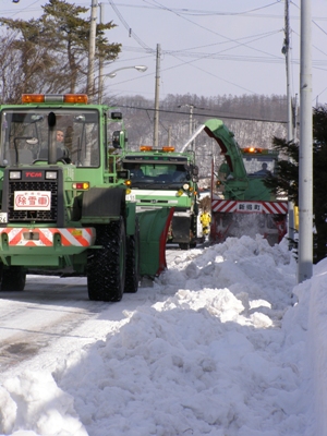 我が家の前の道路に溜まった雪の排雪が行われました。久しぶりに気温が上がって道路の雪も少し融けかかっていました。町の大型ダンプカー、ショベルカーに、雪を積み込むロータリー車がセットになってやってきました。 ショベルカーで雪をかき集め、ロータリー車でダンプカーに雪を積み込みます。ものの30秒ほどでダンプカーの荷台いっぱいにすることができます。 ダンプカーは、雪を運搬する途中車体下部に抱いた路面整正装置で道路の氷を削っていきます。 札幌などの大都市では、市街地の道路延長も長く、除排雪もままならないとのことで、町内会も費用を出して排雪を行っているとのことですが、わが町ではすべて町がやってくれます。小回りが利く小さな町のメリットでしょう。でも、この雪は暖かくなると融けて川に流れてしまうのです。かけた莫大な費用は融けて流れて何も残りません。雪国の宿命です。最近、こうした雪を保存して、夏場の冷房、野菜などの冷蔵保存に利用する研究が行われています。早く実用化できればよいなと思うsobajin です。
