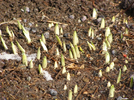 ふきのとうの画像アップしたのですが灯台下暗しでした。我が家の塀の下の歩道にある植樹枡で水仙の芽が出ていました。 歩道にあった雪も、先日の排雪と陽気で融け植樹枡が顔を出したのですが、水仙も一緒に芽を出していました。水仙 って強いんですね。 庭の雪はまだ50センチほど積もっていますが、雪が融けると一番先に花を咲かせるのは「クロッカス」ですが、こちらはまだ雪の下、でも芽を出す準備をしているのでしょうね。そうそう、昨日我が家にニューフェイスが登場しました。観賞用とのことですが「トマト」の苗をいただきました。とりあえず日なたに置いてみます。