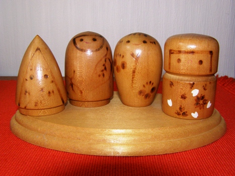 人形シリーズになりましたね。今日は、飾り棚の中から4つの人形がお出ましです。木目が表情に生きています。そして、暖かさをかもし出してくれます。