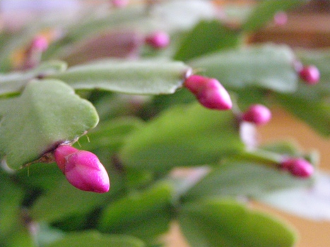 昨年末には満開のクリスマスカクタスをご紹介したのですが、いま、なんとそのクリスマスカクタスが蕾を膨らませているのです。花が終った後、花ガラを摘み、お礼肥えを与えお休みいただいていたのですが、先日気が付くと葉の先に紅い粒が見え始めていたのです。春の陽射しを受け暖かくなってきたいま蕾が大きくなってきました。 クリスマスカクタス、昨年の花でない証拠をつけておかなければ信用されないかもしれません。先日紹介したトマトの鉢植えとのツーショットをつけておきます。 なんともはや気の早いクリスマスカクタスです。クリスマスまで咲き続けるつもりなんでしょうか。原因は、クリスマスカクタスは「短日植物」つまり日が短くなると蕾をつける習慣がある植物なのです。居間に置いてあったときは、照明で陽が長い状態でした。花が終わって夜はほとんど使わない和室でお休みいただいたときに温度だけは確保してありました。つまり夜は暗くて長い状態で置いてあったのです。クリスマスまでは持たないのは当然で、雪が融け気温が上がったら外でしっかりと栄養をつけてもらいます。いずれにしても、年に2回も花を楽しめるクリスマスカクタスに感謝です。