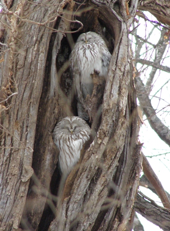 sobajin の住む町は、とにかく自然がいっぱいの町なんです。行動派のブログ仲間に刺激され、町内ウォッチングに出かけました。街中からそんなに離れていないところでなんと「エゾフクロウ」のつがいを発見、ラッキー !! 早速ご紹介します。 昨年から町の人たちの間で話題になっていた「エゾフクロウ」ですが、ようやく見つけました。愛くるしい様子にしばしうっとり、手間隙惜しんでは良いネタに恵まれないことを教えられました。このエゾフクロウ君、4月頃まではこの場所にいるようです。でも、とても神経質なので驚かさないようにしてあげたいものです。わが町は、自然がいっぱいで街中をキタキツネが走るは、公園ではエゾリスがあそんでいるはで、池にはカモ類、街中を流れる川には白鳥まで来るんです。エゾフクロウエゾフクロウは、本州に住むフクロウの亜種(フクロウ目フクロウ科フクロウ(エゾフクロウ))で、北海道に生息しています。全長約45~50cm、翼長約100cmほどになるようです。外見は白っぽい色をしており、シマフクロウより美しいという人もいます。絶滅危惧種のシマフクロウのほうが話題になりますが、エゾフクロウのほうがだんぜん発見しやすい鳥といわれています。アイヌの人たちは「クンネレクカムイ」(闇に鳴く神)と呼んできました。
