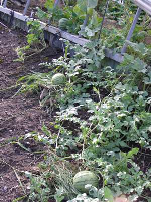 お盆が過ぎて、萩が咲き始め秋風を感じる今日この頃なのですが、温暖化してきていることを実感させることがあります。このあたりでは、以前スイカなどはできなかったのですが、ご近所の N さんの畑を見ると、なんとスイカが転がっているではありませんか。 ビニールハウスから飛び出したスイカの玉が3つ、なっていました。小ぶりですがおいしそうに実っています。 最近では店先でも小ぶりな玉が売られていますが、縞模様からそろそろ食べ時を迎えているのではないか、などとおせっかいをやきたくなりました。