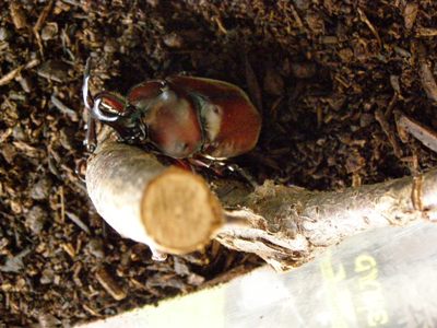 6月から挑戦していたカブトムシの飼育(こちら)、今夜2匹が羽化して出てきました、というより出してみました。 でてきたのは2匹の男の子でした。すぐに4リットルのペットボトルを使った特製の飼育ケースに移し観察を始めました。市販の飼育マットの上に、椎茸のホダ木の朽ちたものを散らし、これまた購入したゼリーを入れたのですが(トップの画像)、 室内の明るいところで作業したため、カブ君ははすぐマットにもぐろうとしました。暗くすると落ち着くのではないかと思っています。あと3つ残っているのですが、メスが出てくると繁殖にも挑戦できそうですし、オスばかりだったらメスを買い求めてこようかとも思っています。興味を示していた孫姫に電話したのですが、寝ているとのことで画像添付のメールを入れておきました。喜ぶのかびっくりするのか楽しみです。とりあえずご報告まで。