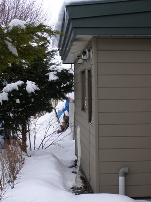 家の裏に行ってびっくりしました。鍾乳洞の氷筍のように地上から1メートルほど成長していました。軒先から雪の融けた水滴がしたたり落ち凍ったものでもないようで不思議でした。 しばし、考えて分かりました。この上に、給湯器と、暖房用ボイラーの給排気口があったのです。灯油を燃焼させるとCO2と水分が発生します。水分が氷点下の外気に触れ冷却されて水となり、厳寒が続く今年氷筍に成長したと思われます。 いつもの年は、屋根の雪が滑り落ちて雪山になっているところですが、今年は、例年にない寒波で氷筍になったのでしょう。屋根から落ちる水ならばツララとなるところですが、珍しい現象です。氷筍というより氷柱が適切ですね。(1/24朝)