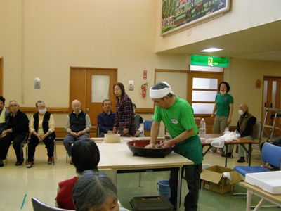 sobajin 所属の屈足手打ちそばの会恒例の行事「手打ち蕎麦訪問」を町内の老人ホーム「やすらぎ荘」で行いました。これは、町内の福祉施設を毎年訪問している会の行事で、利用者の皆さんはいつも楽しみにしてくれています。今日は、6人の打ち手と4人のアシスタント計10人で訪問、14キログラムのお蕎麦をお昼に間に合うように打ちあげました。 打ちあげたお蕎麦は、海老天蕎麦にしてだされ、sobajin たちも利用者の皆さん、日帰りディサービスの皆さんらと一緒に食べてきました。 sobajin たちの手打ち蕎麦訪問は、毎年の行事ですが、今年の行事としては3か所目、残すはあと1か所来月18日に施設を訪問します。sobajin たちができるささやかなボランティアです。