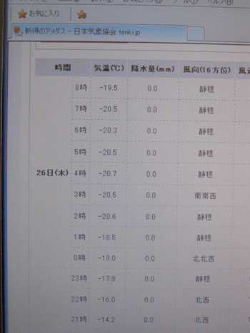 全国的に冷え込んだ昨日今日ですが、日本一寒いと CM にも登場する町、陸別町。今朝7時過ぎに氷点下29.1度を記録しました。sobajin の町は、氷点下13.4度、最高気温も氷点下6.1度だでした。まさに凍れていると言った表現がぴったりです。ところで、sobajin が行った地鶏の施設の冷凍庫、庫内の温度は を表示していました。ちなみに冷蔵庫は、 なんと冷凍庫の方が暖かいではありませんか。-29度の世界想像できますか。このきおん sobajin の町でも最近はない温度です。こちらでは、冬の間氷点下の気温であっても「氷点下○○度、マイナス○○度」とは言わないんです。数字だけ言って通じるのです。寒さ厳しい折風邪など引かぬようご自愛ください。