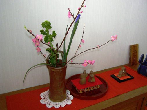 今日は、まだ雪が降っています。午前中帯広まで買い物へ行ってきました。桃の花があったので買い求めました。雛飾りも出し入れが大変とかで最近は「しんとく焼」の人形で済ませています。 外は雪、でも確実に春は近づいているようです。今夜は一足早くバラチラシでも作りましょうか。