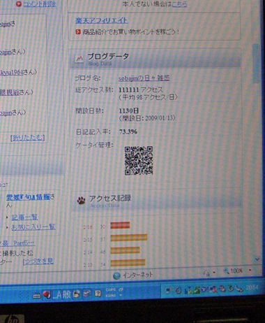 今夜、アクセス数が 111,111を踏みました。みなさまのおかげです。でも、どなたが記念アクセスだったのかわかりません。申告いただけますか。2009.1.13開設以来1,130日目でした。最近、更新頻度が鈍り更新率が落ちています。歳とともに、少し動きが鈍っているのかもしれません。また、楽天ブログのシステム改変も多少影響があるのかもしれません。暖かくなったらまたがんばりたいと思いますので、これからもよろしくお願いします。アメーバーのほうにも開設(http://ameblo.jp/sobajin/)していますが、当分の間こちらを主力で行きたいと思います。