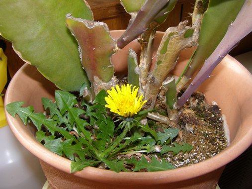 冬の最中に一輪のタンポポが咲きました。室内にある孔雀サボテンの鉢の中で咲いています。 夏の間にタンポポの種が飛んできて鉢の中に入っていたのでしょう。外の寒さとは別にきれいな色を見せてくれています。早く春が来ないかなー。