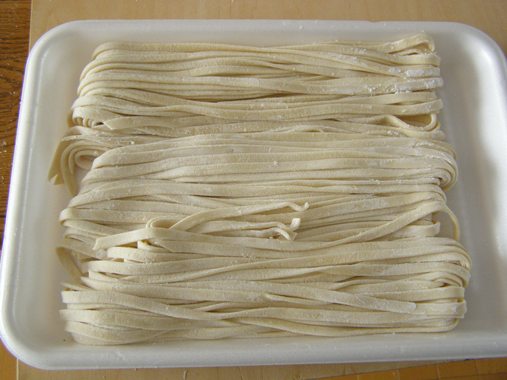 手打ちうどんを……と、思い立って始めたのですが、レシピどおりとは行かず、途中からパスタマシーンにヘルプしてもらいました。 中力粉ですが、塩水が少なかったのか腰が強く延しがうまくいきませんでした。仕方なくパスタマシーンの登場となりました。7ミリから延し始め3ミリまで数回ローラーを通します。そのあと切りまでお世話になってしまいました。 とりあえず順調だったのですが、麺帯自体が延しムラになったような状態となってしまいました。根気よく手延しして手切りすべきでした。茹で時間も3ミリ厚手は15分程度とあり、時間通り茹でたのですが長すぎたようです。12分程度でよいようです。 素うどんでいただきましたが、それなりのお味でした。つゆはヒガシマルのうどんスープでした。 蕎麦も奥深いけれど、うどんも難しいことを実感しました。