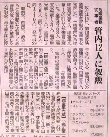 危険業務従事功労叙勲の発表があった。まいとしはるとあきにおこなわれているこのじょくん、警察官・自衛官・消防士など著しく危険性の高い業務に精励した人が対象です。今回の叙勲sobajin の住む十勝管内では、12名の方が受章されました。うち4人の方がsobajin の元同僚、知友人でした。消防署長を勤められた方2人、趣味やスポーツを通じて一緒だった自衛官が2人です。いずれの方も、その道一筋、危険と向き合ってきた方ばかりです。心から受章をお祝いしたいと思います。