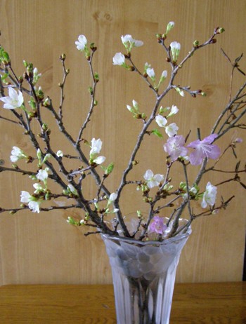 北国では宿命の「雪」庭に積もる雪は時には庭木の枝を折ってしまう悪さをします。今年、チシマサクラやエゾムラサキツツジの枝が折れていました。雪解けにその枝を室内に入れ花瓶に挿しておきました。その「チシマサクラ」の蕾が昨夜から開きはじめ可憐な花を見せてくれています。 一緒に挿しておいた「エゾムラサキツツジ」も咲いています。庭では、開花まであと10日から2週間かかることでしょう。