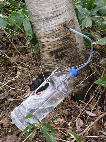 FB友のN氏から教えてもらった「白樺樹液」の採取。朝晩フィールドに通っています。でも、相手は自然界、教えてもらうことばかりです。天候、気温によって出てくる樹液の量が違います。 今日は、弟と、長男のところへ初めて届けました。そして、町役場へも行って、町長さんらにも試飲してもらいました。町の中には沢山の白樺があります。簡単な装置で採取できる季節の贈り物、何とか利用できないものか話してきました。 樹液自体の成分組成を見ても健康飲料として最高のものですから、採れる間一所懸命いただくことにします。