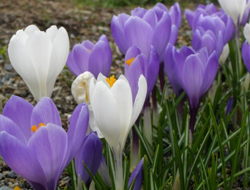 クロッカスの植え込みも、雪の融け具合で不ぞろいながらも花開きだしました。 白、紫、黄色と春を告げる使者です。