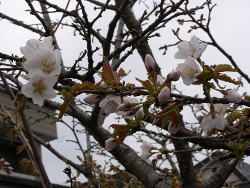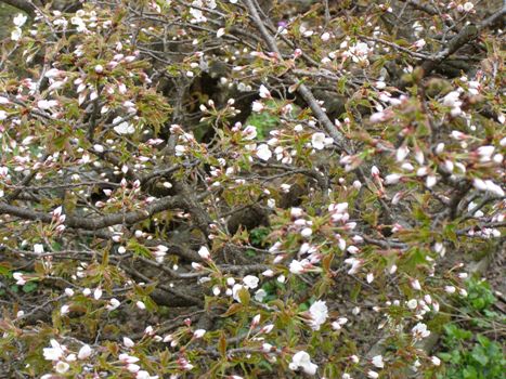 いつものことながら庭の「チシマサクラ」が開花しました。昨年の開花は5月16日、どうしたことか1週間も早いのです。狂ってきたのでしょうか。わが家の庭は、桜の開花とともににぎやかさが戻ってきました。水仙が口紅水仙を残して満開に、エゾムラサキツツジも満開です。白い花をつけるエゾムラサキツツジの変種も咲いています。 黄色のレンギョウも鮮やかな黄色を自慢しています。 紫色のムスカリも満開。 チューリップと、ムラサキヤシオツツジはもうすく花開きそうです。そして、そのあとはツツジ類が咲き始めます。 当分の間はいろいろな花が楽しめそうです。