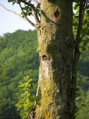 sobajin が毎日通うパークゴルフ場のコース脇に、ヤマゲラの営巣木があります。2,3日前に気がついたのですが、母鳥がせっせと餌を運んでいました。ショットもそこそこに観察すると数羽の仔鳥がいるようです。 昨日、夕方カメラを持ち眺めていると、仔鳥が顔を出しました。すると上の枝にいた親鳥が警戒の鳴き声をあげ仔鳥はすぐ引っ込んでしまいました。 今日また観察すると、頭を出してさえずっています。近くの別な木には、親鳥が盛んにさえずっています。これはきっと巣立ちを促しているのだと思いました。 モスグリーンの身体に、頭の赤い印はオス、頭に赤がないこちらはメス、数を確認するまでには至りませんでしたが、巣立ちはもうすぐのようです。