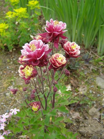 庭のオダマキが咲き始めました。少し変わった種類です。 オダマキの近くには、ヒメシャクナゲも咲いています。 少し肌寒い今日ですが、ツツジたちには花持ちのする気温のようで、満開のツツジ、開き始めたツツジがあります。明日ご紹介します。