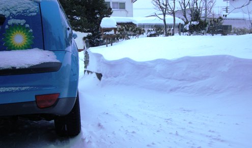 吹き溜まりを除雪車が玄関前に寄せていきます。