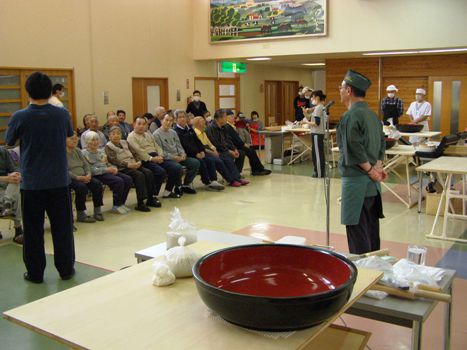 メンバーが手打ちを始めると、腕に覚えのあるお年寄りらもちかくに近くによってきて、蕎麦打ちを体験、楽しいひと時を過ごしました。お昼には皆さんと一緒に打ったばかりのお蕎麦をいただいて交流して来ました。